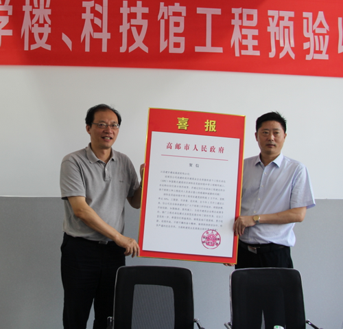 8月29日上午,集團宿遷分公司承建的泗陽縣實驗初級中學工程順利通過預驗。高郵市人民政府向集團發來賀信,高郵市建管局副局長緒軍受李生副市長、徐曉君局長的委托,赴項目驗收現場贈送喜報,集團董事長管民良接受喜報。泗陽縣住建局副局長周娟、泗陽縣質監站站長李峰、監督辦主任胡緒寶、高郵建管局行業科長周蘇里、集團總經理管民祥、副總經理張天桃、宿遷分公司經理湯真標等相關領導出席活動。