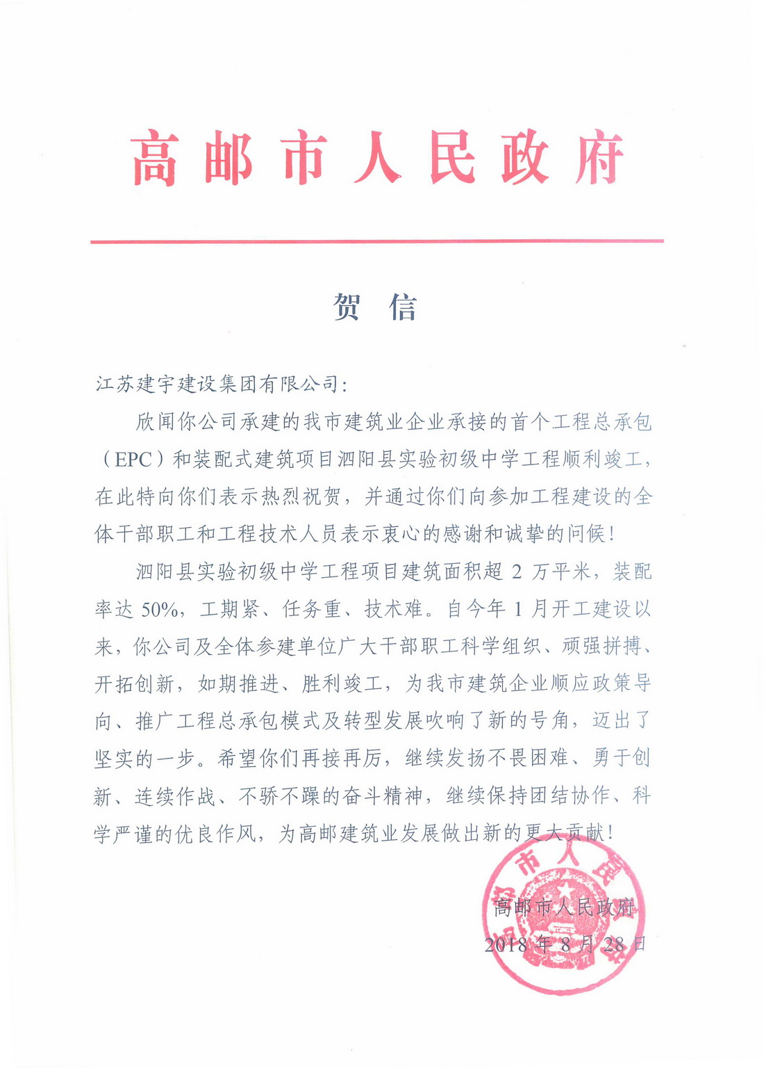 賀信說:欣聞你公司承建的我市建筑業企業承接的首個工程總承包(EPC)和裝配式建筑項目泗陽縣實驗初級中學工程順利竣工,在此特向你們表示熱烈祝賀,并通過你們向參加工程建設的全體干部職工和工程技術人員表示衷心的感謝和誠摯的問候!