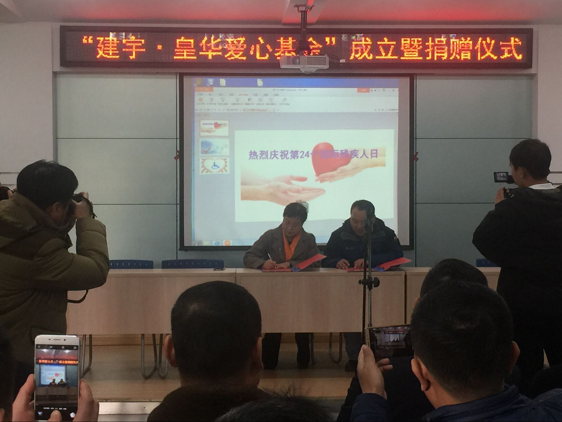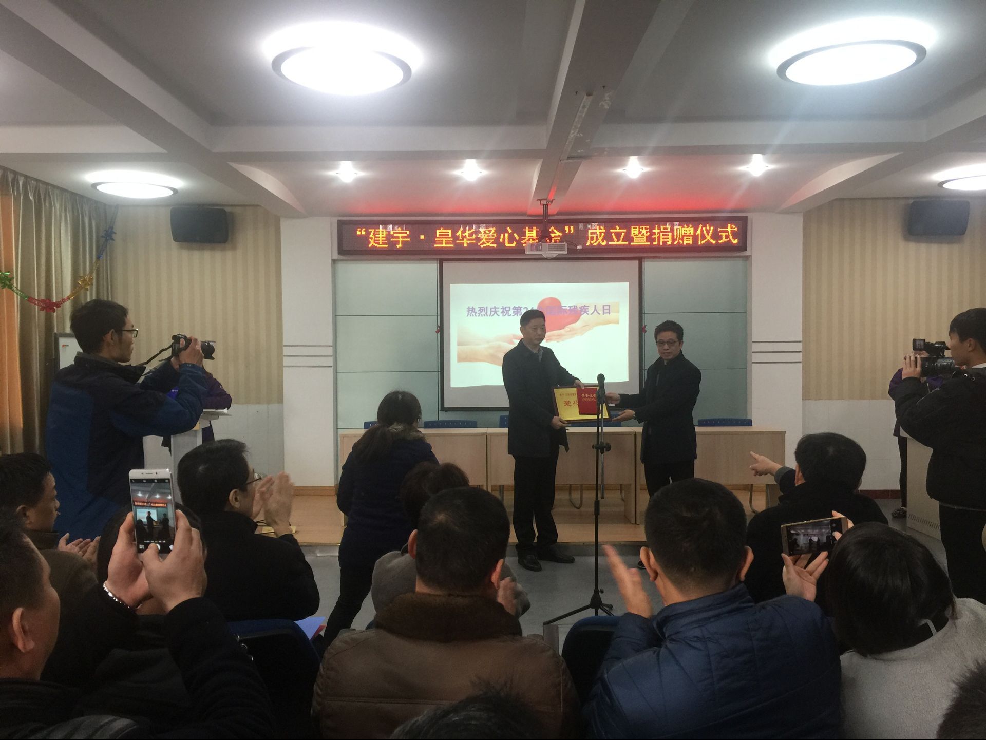 12月2日上午九時,荷花塘特校會議廳內涌動著愛的暖流,“建宇?皇華愛心基金捐助儀式”在此舉行,市教育局邵正祥副局長、市殘聯吉平副理事長、建宇集團管民良董事長、黃葉寶副總經理、皇華國際大酒店王衛紅董事長、張桂新總經理等集團機關全體和皇華酒店的部門負責人參加了活動。