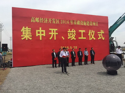 2016年518日上午,高郵經濟開發區2016年重點基礎設施項目開工、竣工儀式在開發區隆重舉行,高郵市市委副書記、市長潘學元、副市長潘建奇、副市長湯學仁、開發區管委會主任趙廣華、房管局局長吳惠山等相關部門領導出席,集團公司董事長管民良、副總經理周耀庭、黃益寶代表施工企業參加。