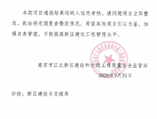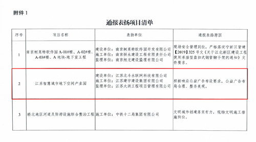 地下空間產業園項目因安全管理、文明施工到位,文明城市創建落實有力,獲得了南京江北新區建交局質安站的通報表揚。項目部積極響應公益廣告布置要求,公益廣告布局合理、整齊美觀受到主管部門領導的一致好評,成為江北新區建筑工地安全文明建設的領頭羊。