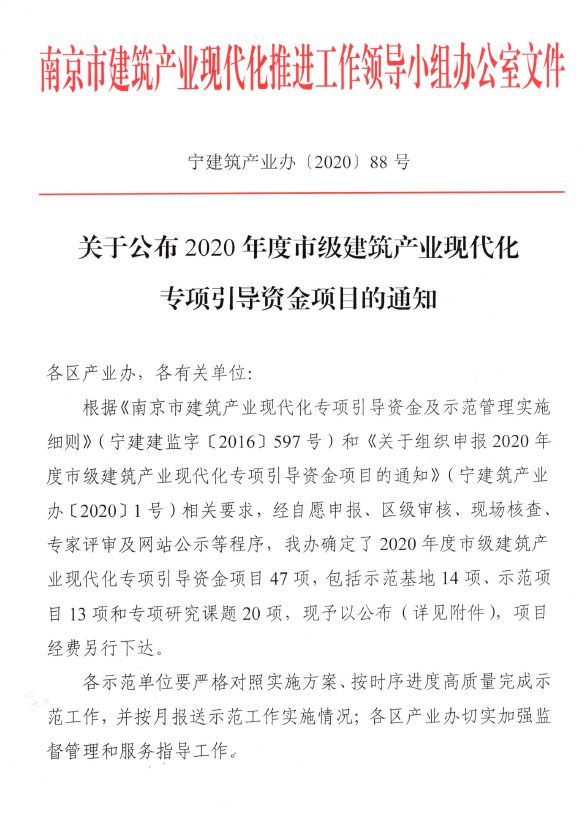 國際化名醫中心項目是集團科技創新的標桿項目,該項目具有體量大、技術復雜、混凝土預制裝配率高等特點,項目經初審、現場核查、專家評審等順利獲評了南京市建筑產業現代化示范項目。
