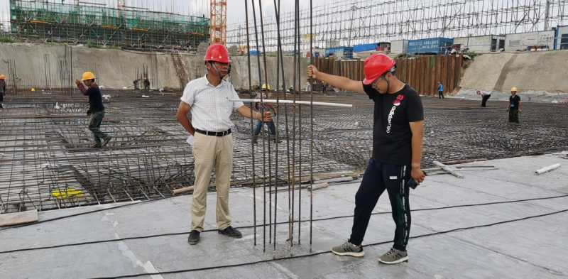 勞務經理吳正祥在后挖土不利的情況下每天頂著高溫酷暑奔波在工地上的每個角落,不到幾日便曬黑了一圈。